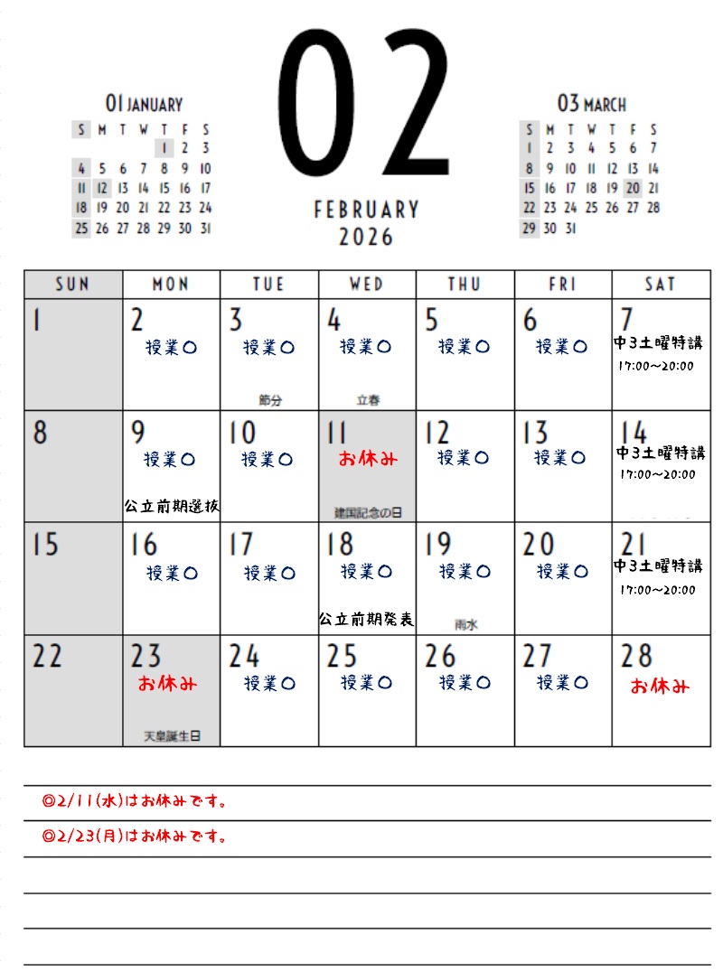 2026年1月30日 / 最終更新日時 : 2026年2月4日 yell-K エールNews 2月授業カレンダー 2/11(水)、23(月)はお休みになります。 FacebookXBlueskyHatenaCopy